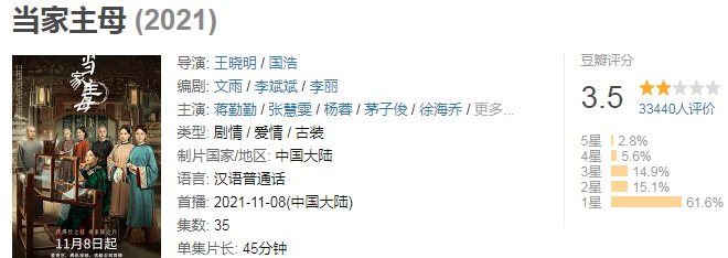 豆瓣评分也很低,仅仅有3.5分,超61%的观众打出一星差评,评论区更是一片吐槽。