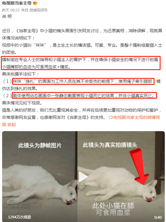 回应大致内容是:该猫咪是土生土长的横店猫,拍摄的时候,有专业人员和猫咪主人看护。最后口部的血液是血浆+糖浆。而猫咪挣扎的画面也是工作人员用绳子牵引的效果,最后小猫死亡的画面也为一张静态图。