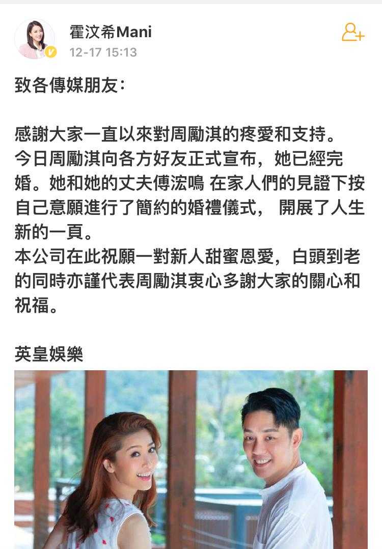 随后,周丽淇经纪人霍汶希也在微博上证实了这一消息,表示“周励淇和丈夫傅浤鸣,在家人的见证下按照自己的意愿进行了简约的婚礼仪式,开展了人生新的一页。”