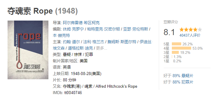 导演希区柯克首部彩色电影,整个故事都发生在一间房子里,靠演员背影黑幕转场造成连续画面,来制造观众视觉连贯的假象。