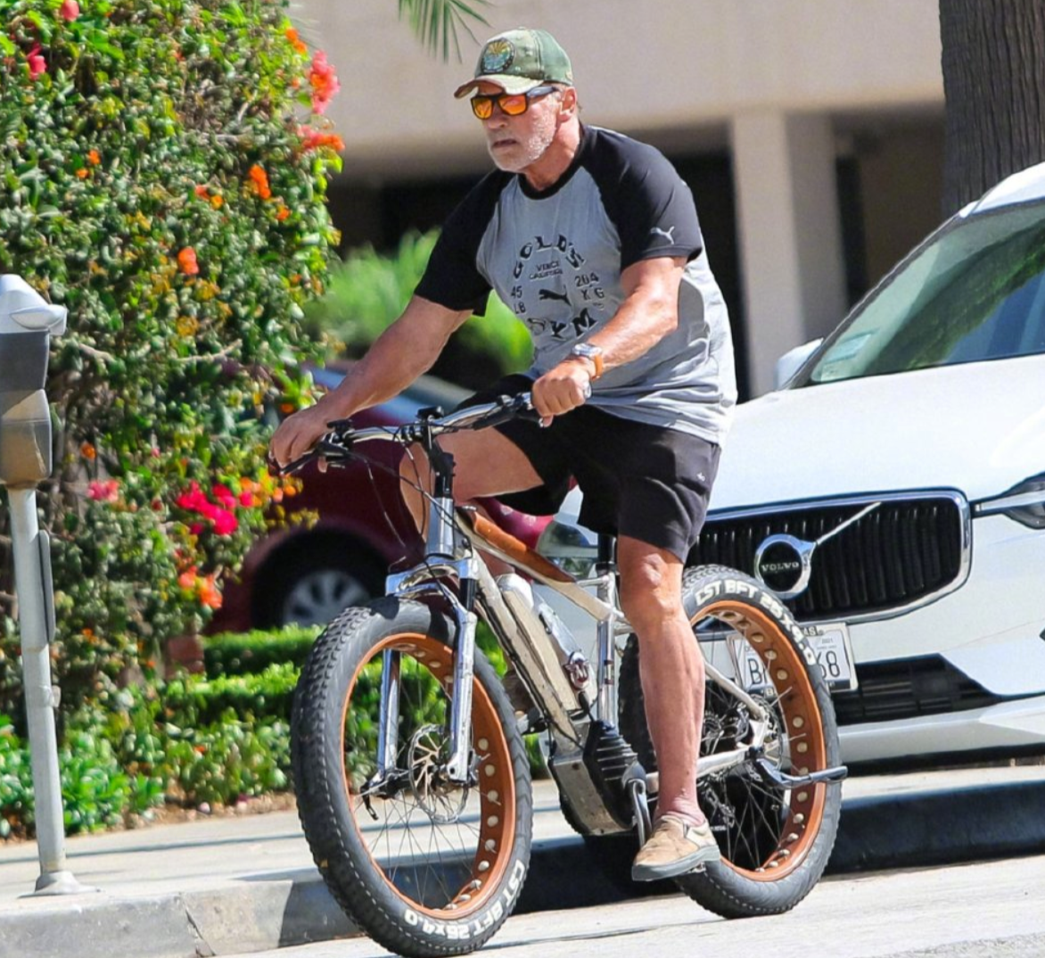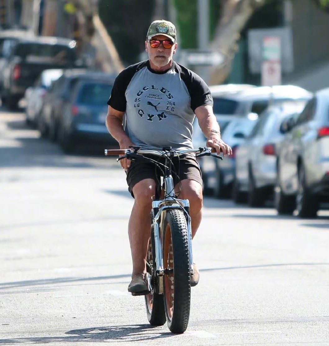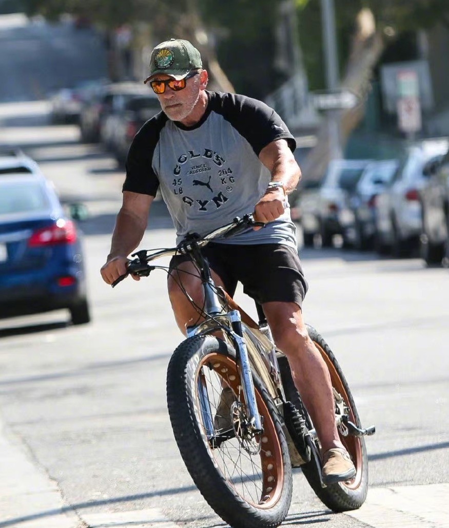 7月22日,施瓦辛格骑自行车外出的街拍照在网上曝光,这位动作巨星的健硕身材迅速引起网友热议。