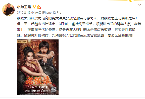 可以说,女艺人徐冬冬自《余罪》的自带热度而慢慢走到观众面前,并以自身的抢眼表现渐渐被更多的观众所认可和喜爱。即便当时的她和“女一号”这三个字毫无瓜葛,但其不懈的努力和在各类型作品中的接连在线的发挥,让她逐渐成为如今能分帐3000万,且炙手可热的网大一姐级人物!就连导演王晶也甘心情愿地以“自来水”的身份力邀徐冬冬和谢苗来主演自己全力打造的新戏《老板娘》,有明晃晃的微博可以作证!