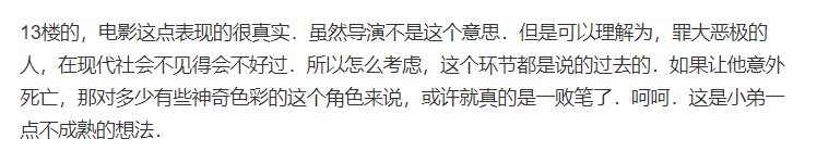 但看完很多人的观点,分享菌发现了一句靠谱的言论,电影开头警察曾说过一句很多人的犯罪其实都是社会所影响的,而男主角卡麦伦为了救自己的妻子反因过失杀人而入狱更说明了电影暗示的内容:好人不一定有好报,而坏人也不一定受惩罚。