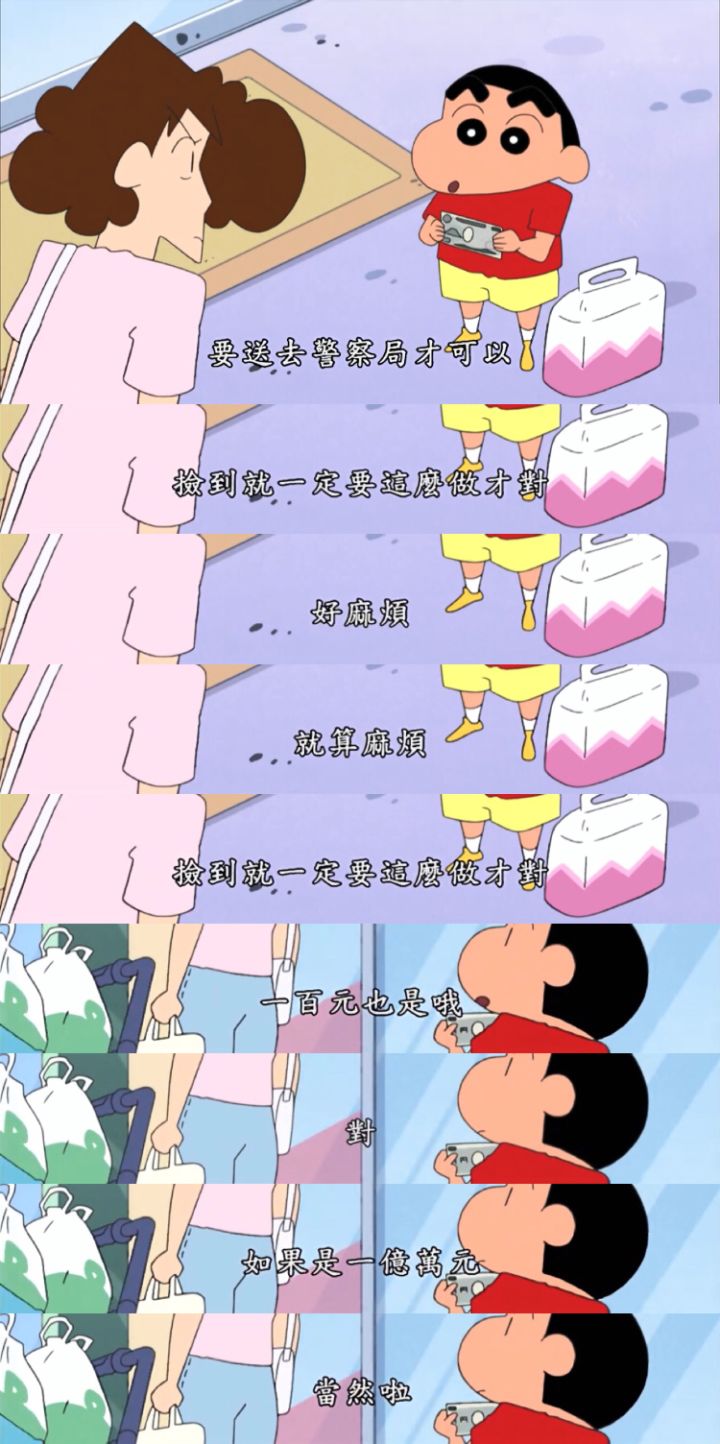 小新想拿捡到的钱拿去买好吃的小饼干,却被美伢制止了,麻麻告诉他不管是一百元还是一亿元都要交到警察局才对。