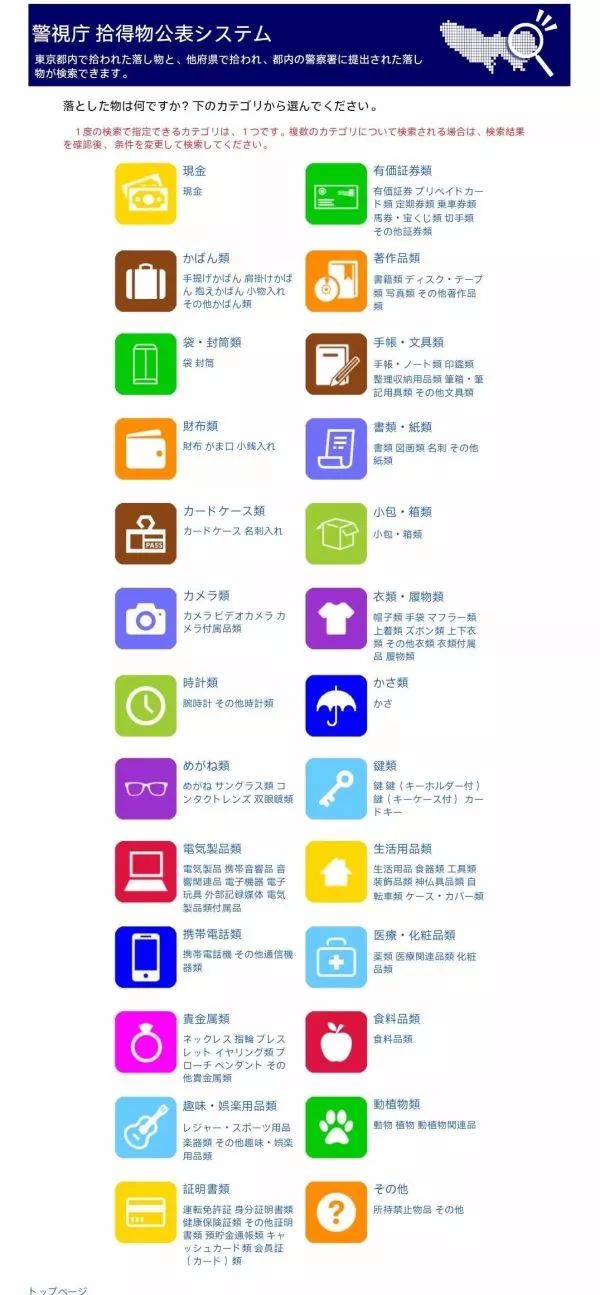 除了线下警察署以外,在网站上的“警视厅拾得物公示表”,也可以通过输入丢失物品的种类、特征、丢失时间和地点查到符合条件的物品。