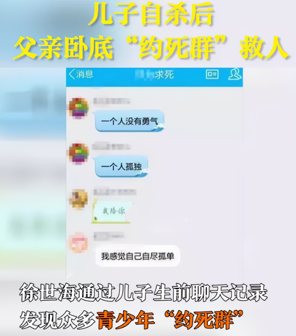 据央视网报道,2020年,17岁男孩小宇自杀,父亲徐世海通过儿子生前聊天记录,发现了众多青少年“约死群”。随后,徐世海长期卧底“约死群”,坚持劝说陌生孩子放弃轻生,挽救几十个年轻的生命。