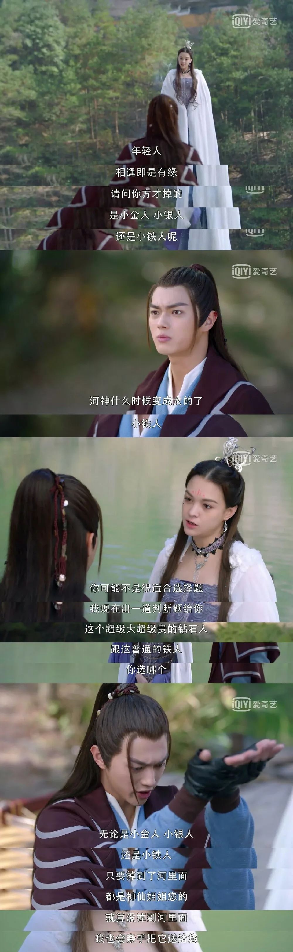 比如在第二集里,王陆闯关的时候,王舞假扮的河神,就给出了一道现代经典的:金斧子、银斧子的梗。