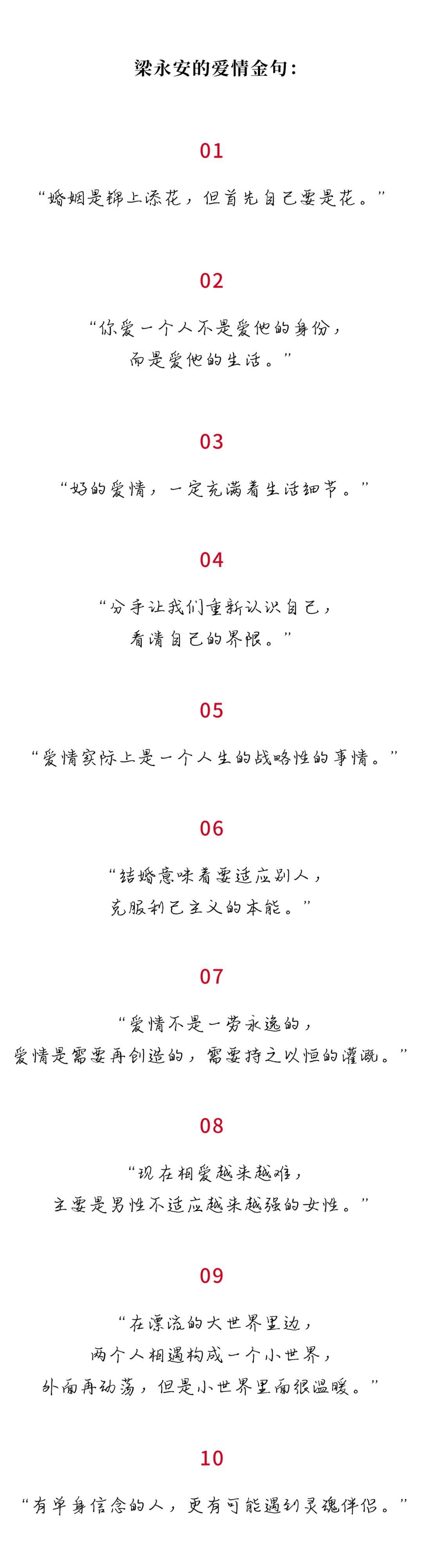 所以,梁永安主张,“今天的年轻人,一定要有特别坚定的单身信念”。也就是说,一个人不依靠别人,也可以在世界上过得很好。先找到自己生命的落点和价值。如此,往上,有可能遇到灵魂伴侣。往下,也可以遇到很善良的恋人。