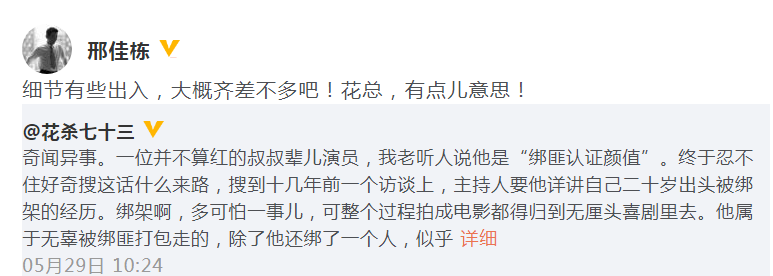 起因是有人在社交媒体上,po出一篇陈年往事的文章,大意是说邢佳栋老师在还是电影学院学生的时候,在一家公司打工,公司老板有经济纠纷被绑匪绑架走,邢佳栋也被一起绑走,但绑匪见邢佳栋很帅,还好吃好喝招待,但老板却被打得鼻青脸肿,最后警方解救了他老板和他,他自己的过程就像度假一样。