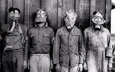 照片摄于1930年,是为了纪念一战时期美国、英国、法国和德国第一次使用防毒面具,照片最上方那一行英文其实是几个国家的名称。
