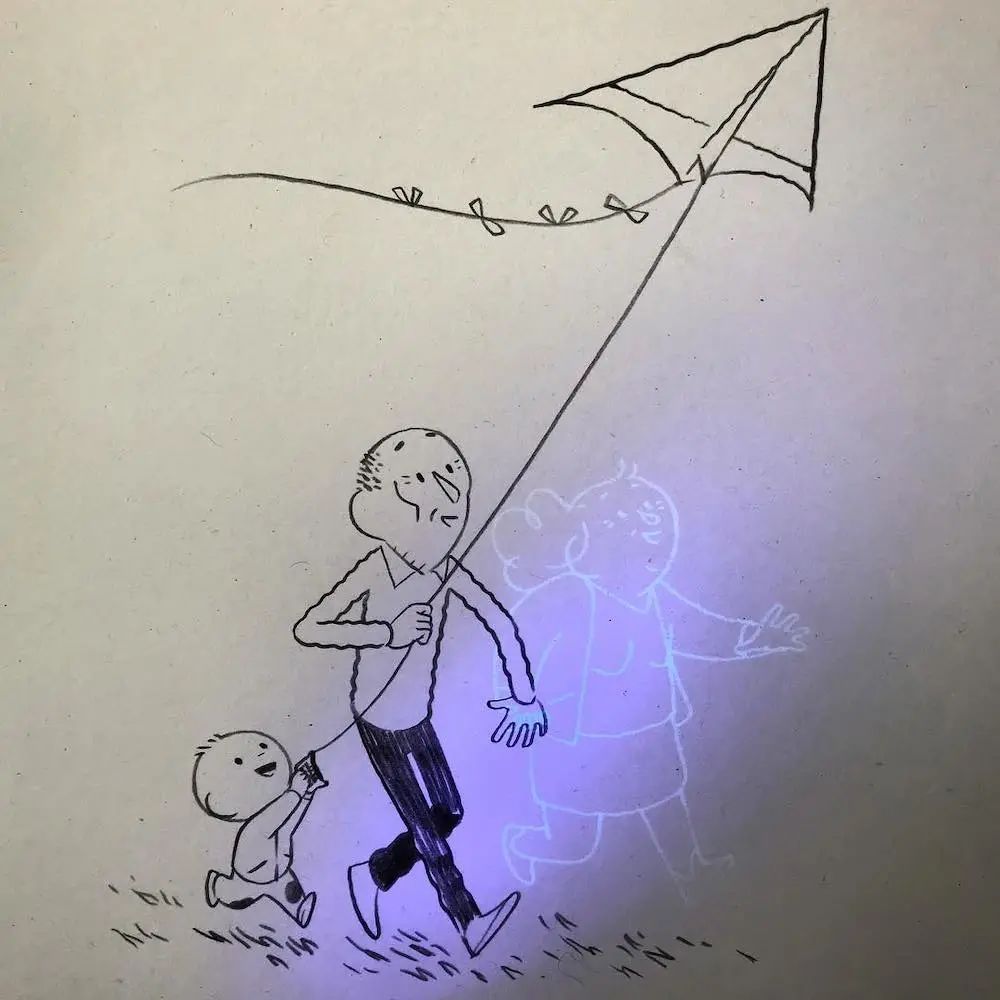 不过,我们每个人都清楚地知道,荧光照射下出现的老人早就离开了这个世界,虽然,玛蒂尔德·多梅克的插画非常简单,但是,这组作品给我们带来的触动一点都不逊色那些复杂的画作,欣赏这组插画作品也让我们意识到身边陪伴我们的那个人重要性,不要等到失去他们之后才后悔没有好好对待他们。