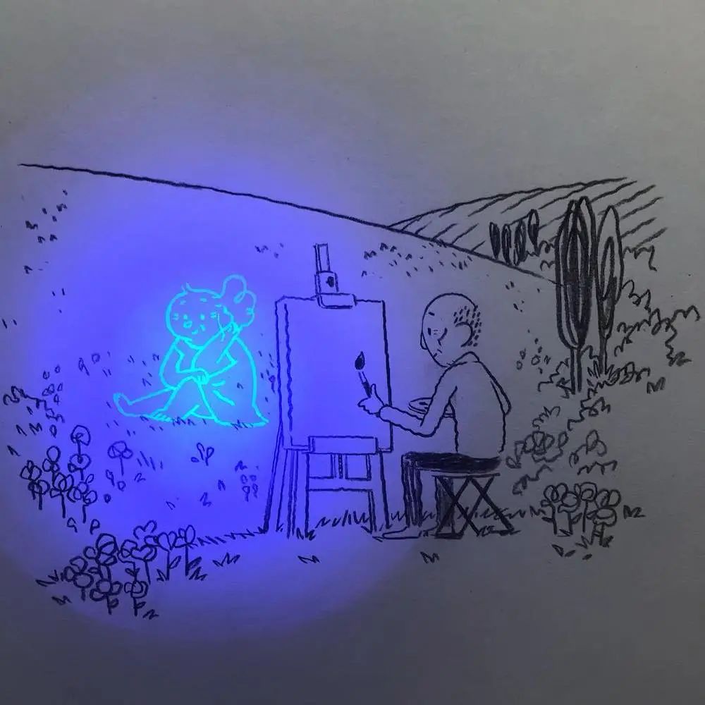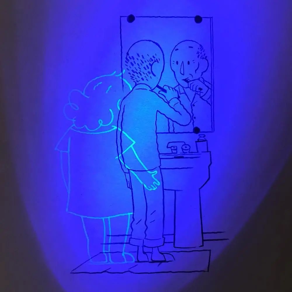 这种有趣的插画奥秘就在于他使用的材料上,玛蒂尔德·多梅克在绘制这组作品时,在画完显现的画面后,又用荧光材料增加了一个老人,于是,经过灯光照射后,我们就可以看到两个老人相互依偎,相互照护的温馨场景。