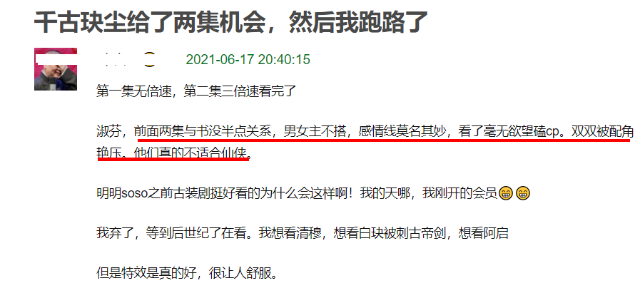 作为一部仙侠偶像剧,《千古玦尘》主演颜值遭网友疯狂吐槽,两人之间还没有cp感,真的是毁原著。原著本身和《花千骨》很像,血虐男女主观众追剧很容易上头,所以《千古玦尘》其实是有成为爆款潜质的,奈何演员不够给力,要颜值没有颜值,要演技没有演技,s级的大制作也救不了场。