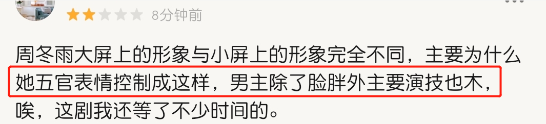 包括季冠霖的配音,也是让不少观众直呼出戏,根本不贴脸,季冠霖的声线比较御姐风,但周冬雨从长相到演技都很小孩,这样看下来观众难免会被劝退。作为三金影后,周冬雨的演技也遭质疑,不少观众表示,对她的滤镜碎了一地。