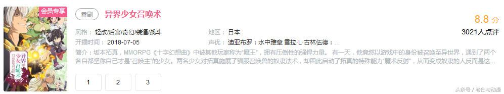 老白感觉大家对异世界后宫类的动漫兴趣不是很浓,七月三部异世界动画,除了续作的骨傲天外,新的异世界动画评分都普遍偏低,也许是因为后宫吧,因此大家都不怎么喜欢看,不然这部番也不会才8.8分