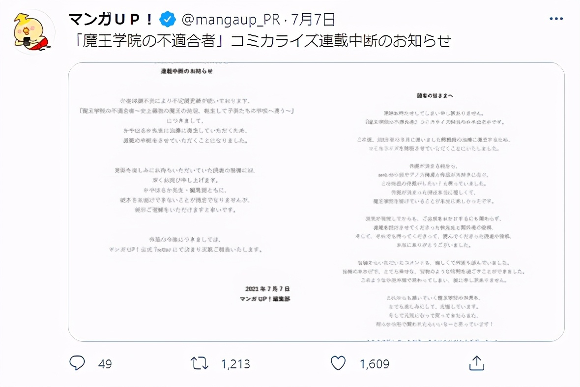 不过可惜的是,漫画作者かやはるか老师在去年的时候患上了胰腺癌而使漫画不得不暂停连载,为此他还有漫画app“マンガUP!”官方还特意发布了公告,说明《魔王学院的不适合者》停更的消息以及原因,并且等漫画作者老师专心治疗、养好病回来后再继续连载的。
