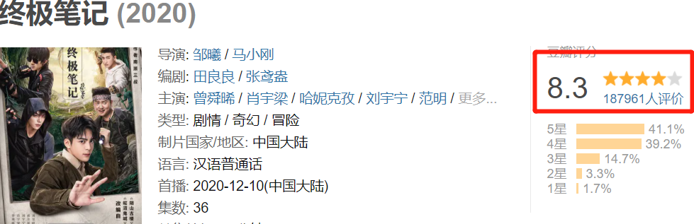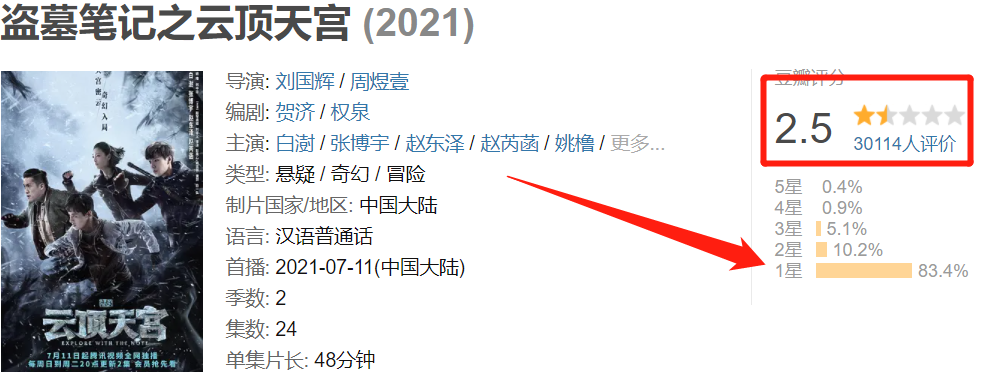 目前《云顶天宫》的评分是2.5分,可以说是所有《盗墓笔记》影视化中评分最低的一部,与《终极笔记》的8.3分形成了鲜明的对比。