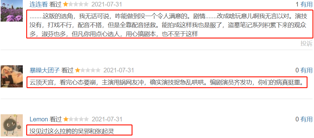 “这版的选角,我无话可说,咋能做到没有一个令人满意的。剧情……改成啥玩意儿啊我无言以对”“云顶天宫,看完心态要崩,主演甩锅网友冲,确实演技捉急乱哄哄”。