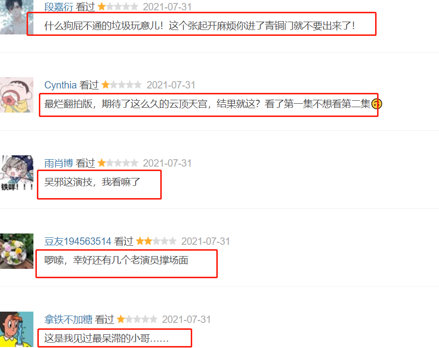 “这个张起开麻烦你进了青铜门就不要出来了”“最烂翻拍版,期待了这么久的云顶天宫,结果就这?看了第一集不想看第二集”“吴邪这演技,我看麻了”。