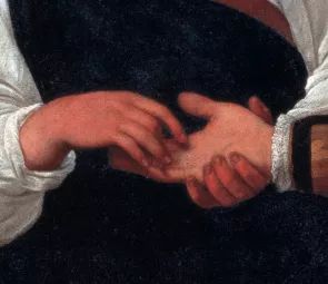 《占卜者》:神秘的吉普赛女郎顺着贵族少年的手掌预测他的命运,他的眼神完全专注于女郎的脸庞,却看不见吉普赛女郎偷偷把他的戒指“顺”走的动作。