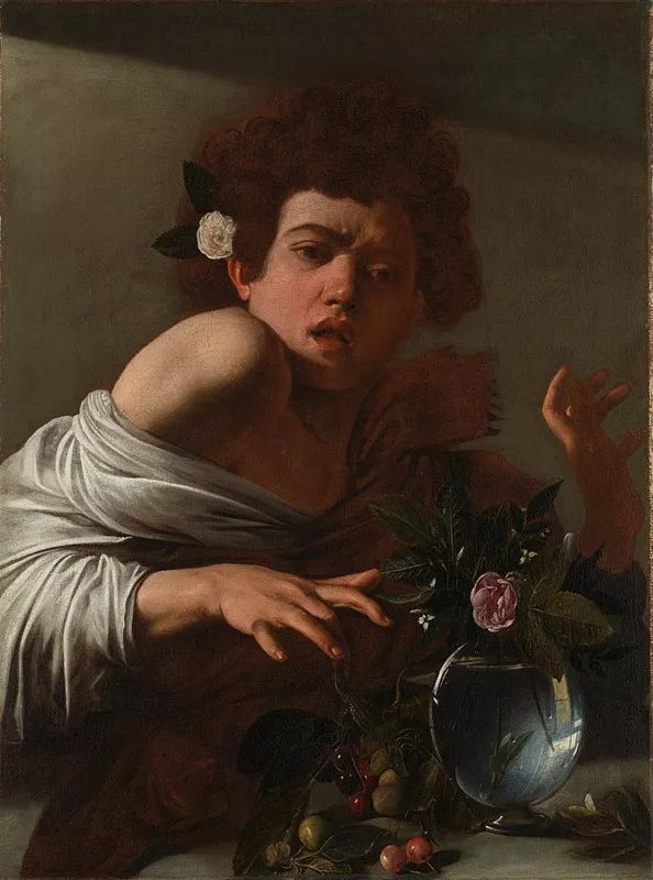 《被蜥蜴咬的男孩》/c.1594-1596:耳后别着花朵儿的少年不小心发现了蜥蜴,惊吓的瞬间被画家完美捕捉,而蜥蜴似乎下一秒就要朝着画外飞出来。