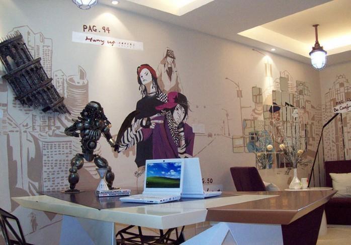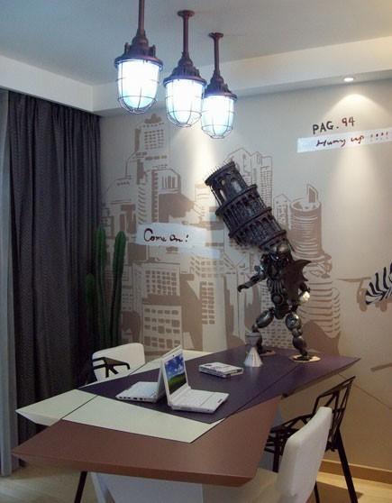 亲朋好友过来玩的时候,进门的第一眼就被手绘漫画墙吸引,浅棕色笔调描绘出城市街道背景,作为主角的是三个活力的街舞少年。