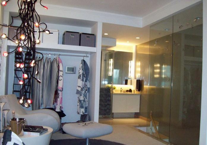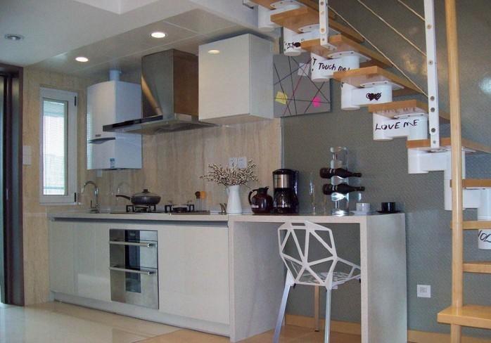 开放式厨房合理的利用了楼梯底下的空间,刚好设计成''一''字型zhzhuti的,搭配白色的组合橱柜。使整个色调更加的统一明了.