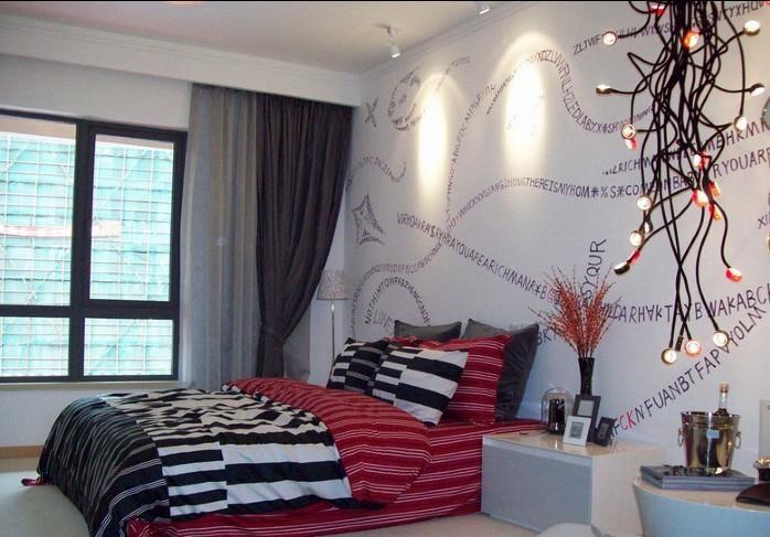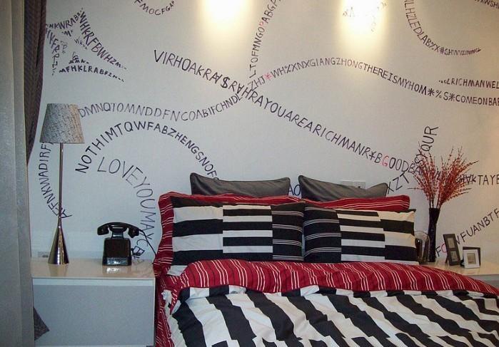 卧室背景墙在设计的时候想到了用狂莽蛛灾的主题来设计,可是画风有点惊悚了一点,女朋友也很反对,所以就用字母数字来代替了。