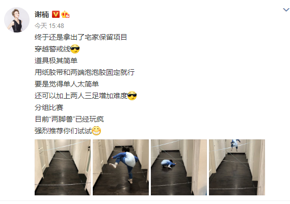 1月25日下午,吴京老婆谢楠在个人社交平台晒出一组6岁大儿子吴所谓玩耍的照片,并附文写道:“终于还是拿出了宅家保留项目,穿越警戒线,道具极其简单,用纸胶带和两端泡泡胶固定就行,要是觉得单人太简单,还可以加上两人三足增加难度,分组比赛,目前,两脚兽已经玩疯,强烈推荐你们试试”。