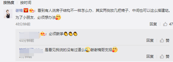 很快谢楠回应道:“看到有人说房子结构不一样怎么办?其实两侧放几把椅子,中间也可以这么搭建搭,为了小朋友,必须想办法”。