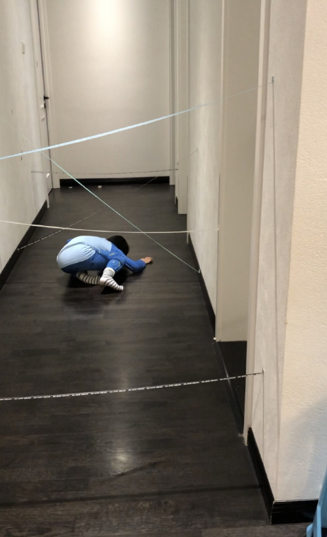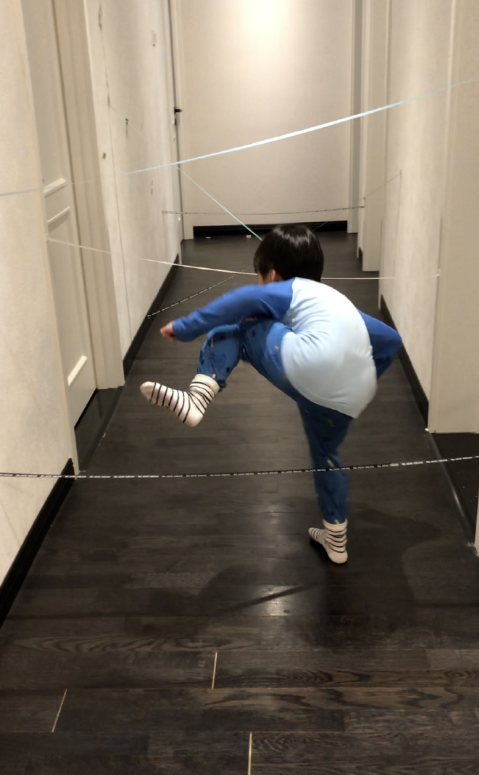 谢楠镜头下,将走廊拉上警戒线的豪宅,一眼看去宛如谍战片现场。不得不说,身为两娃妈妈的谢楠真的是在带娃中积累了丰富的经验,太会玩儿了吧。
