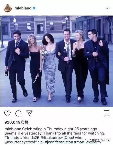 今年9月20日,《老友记》中饰演莫妮卡、乔伊、菲比、罗斯的几位演员在社交媒体发文,提醒大家不要忘记该剧开播25周年的时刻。他们写道:“庆祝25年前那个周四的夜晚,一切仿佛就发生在昨天,或许我们分隔在不同的地方,但我们永远在一起,感谢所有的观众。”