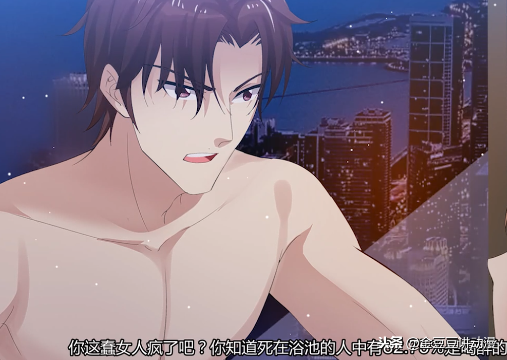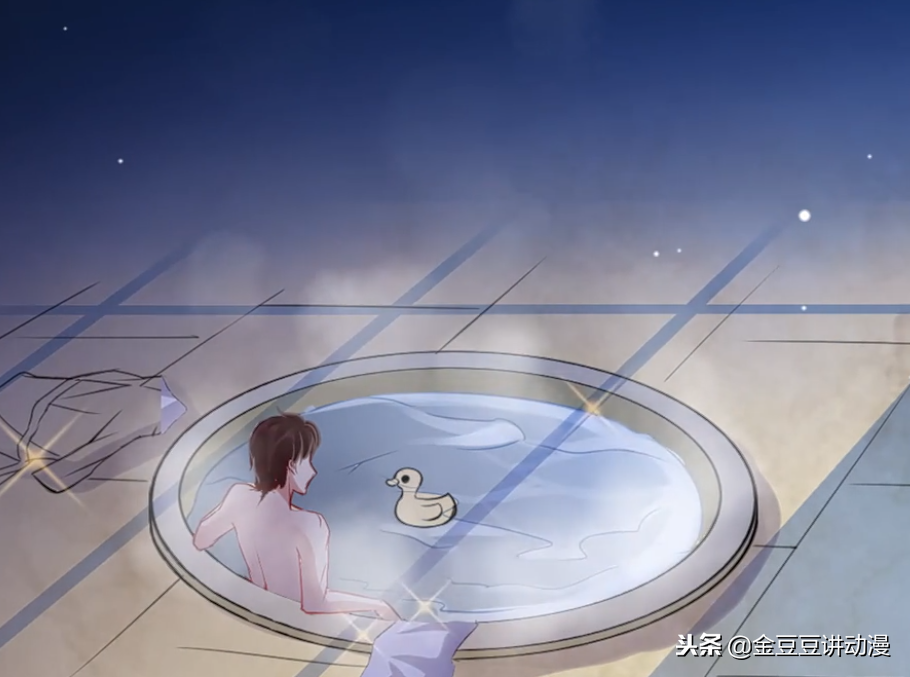 然后动画就一个转场,画面来到了男主这边。这里男主正准备下水洗澡,水温舒服的男主手放在脖子梗那就来回的搓,这下子我是看明白了,男主肯定是在搓泥啊。我觉得有钱人的生活也不过这样嘛,洗个澡连个搓背师傅都没有,还得自己动手,突然我就觉得我比有钱人的生活档次高了不止一点。