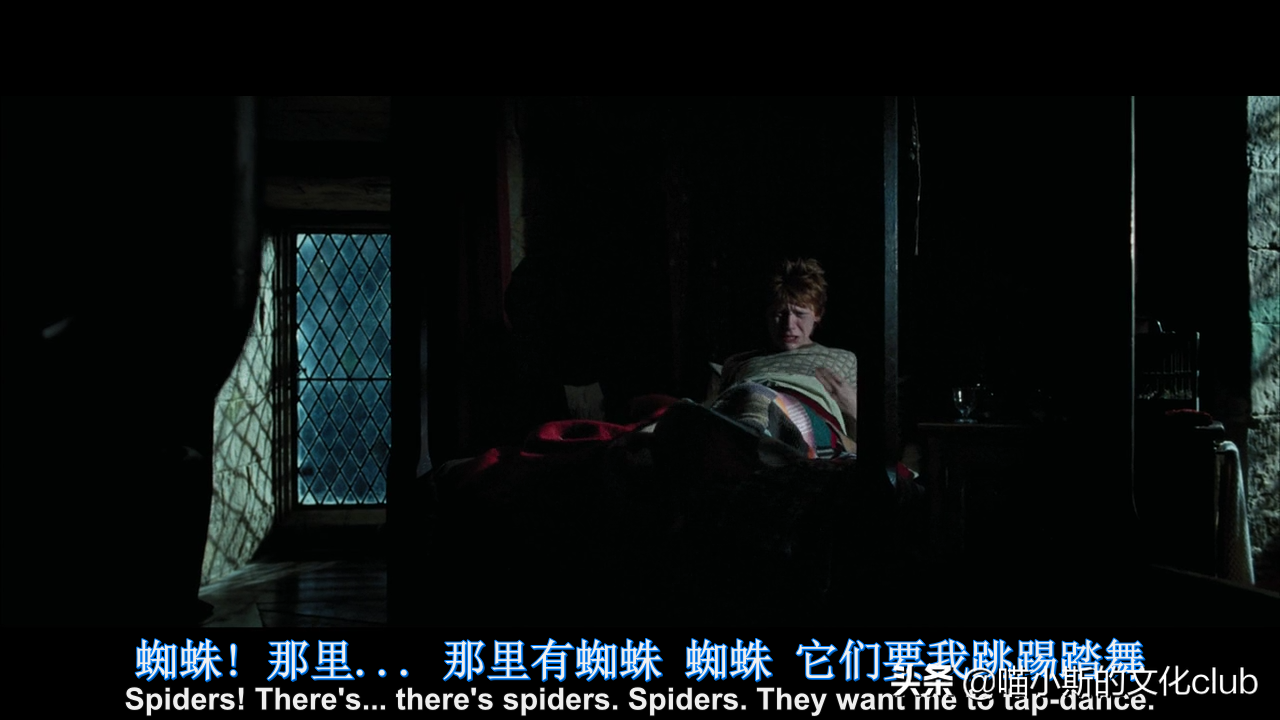 夜深人静的时候,哈利拿着活点地图看,这时罗恩从噩梦中惊醒,他梦到蜘蛛让他跳踢踏舞。就在下一部《火焰杯》中,就真地出现了这一幕。假穆迪在课上演示不可饶恕咒,蜘蛛痛苦地在跳“踢踏舞”。话说,罗恩在这一系列中有多次精准的神预言,但讽刺的是,他的占卜课却挂了。