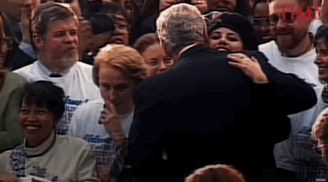 " ▲ 1996年10月,民主党筹款活动现场,他们在众目睽睽下拥抱。