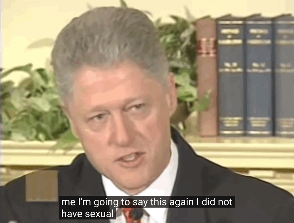 再之后,1月26日,克林顿总统出现在电视上,信誓旦旦地表示,“我和那位女士没有发生性关系,莱温斯基小姐…”