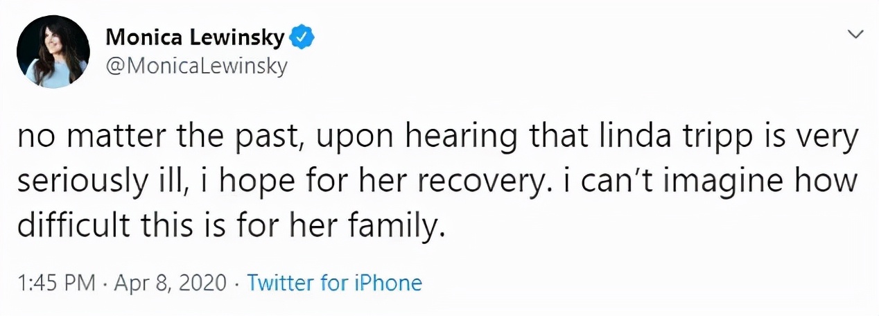 ▲ 时过境迁,过去还为背叛耿耿于怀的莱温斯基早已释怀,她还在推特发文祝愿琳达早日康复,可惜为时已晚。