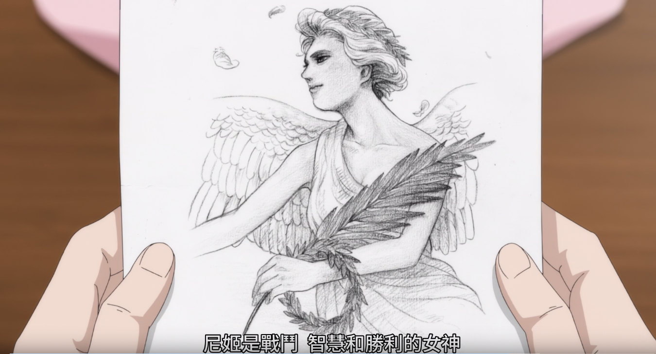 森学姐给他画了一幅智慧和胜利女神——尼姬。(很好看)