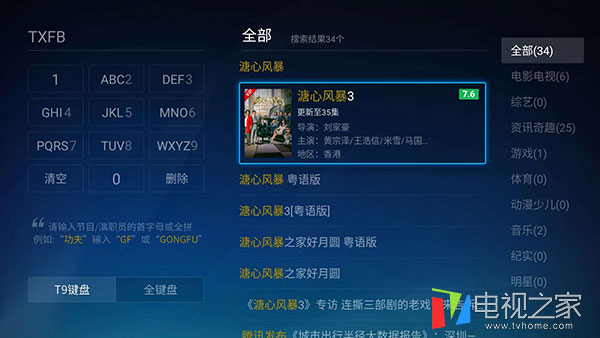 进入电视猫【搜索】界面,输入所需资源的首个字母,即:溏心风暴-txfb。在右侧点击需要观看的资源,即可进行观看了。