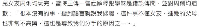 然后媒体又称他王传一脚踏两条船,劈腿学妹。王传一当时就回应事情是谣言,但这则消息已经使女方家长很不高兴了。王传一也直说这是他和周俐均分手的原因之一。