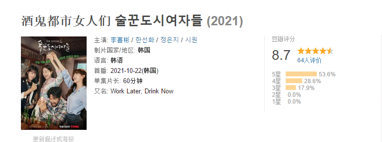 韩剧好久没有更新,小编在近期的新剧中挖到了宝藏剧,由郑恩地、李善彬、韩善花主演的治愈系新剧《酒鬼都市女人们》。