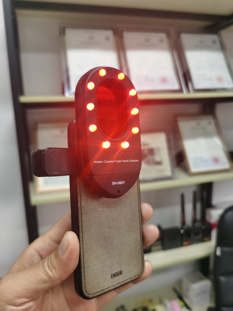 由于针孔镜头里一定会有球面镜,当这款红光检测仪的红色的led光照在球面镜上时,就会有一个非常特殊的反光亮点,“不规则,跟其他的反光亮点不一样”。而且,这些检测设备上都会有一个由特殊光学镜片做成的观测孔。