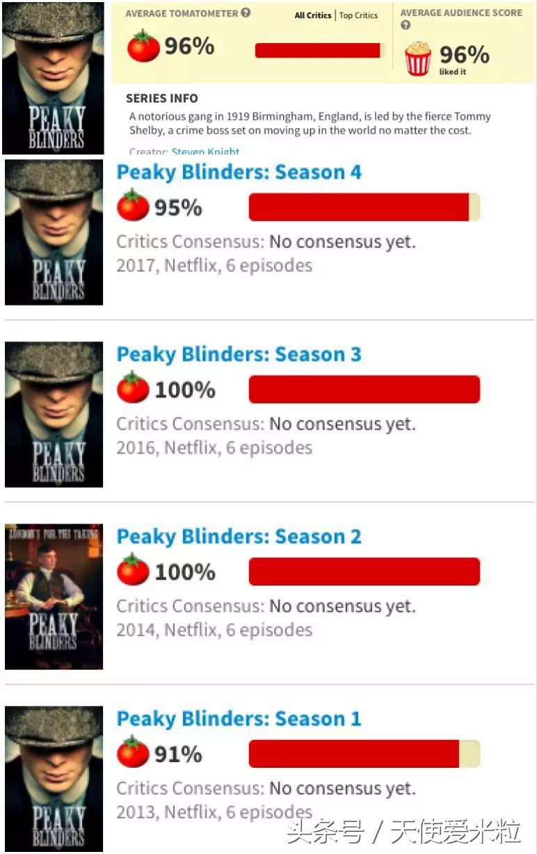 一如英剧的短小精悍,《浴血黑帮》每季不过6集,13年开播至今只播了4季,平均烂番茄96%,其中第二季和第三季,烂番茄满分。