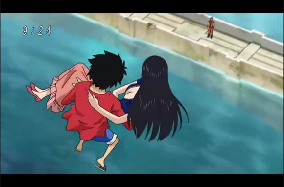 在司法岛篇中,罗飞一伙击溃了cp9,准备跳海登船逃跑。路飞、罗宾和乔巴被鱼人婆婆扔向了甲板,路飞和乔巴完美坠地。但是身为美女的罗宾就不一样了,罗宾被弗兰奇稳稳公主抱接住,两人还看对了眼呢~注意后面山治的表情,有点可怕~