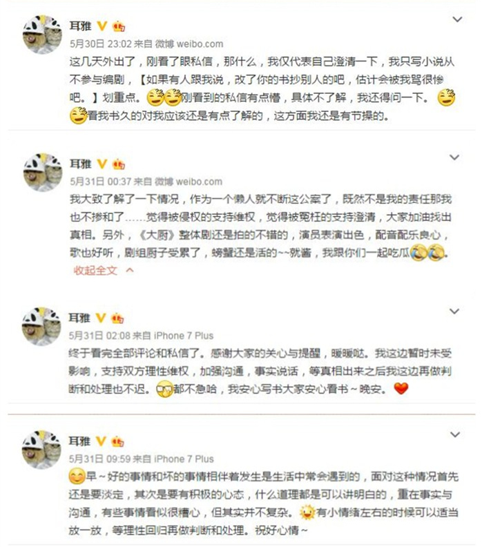 事发后,编剧曾发长微博回应,但很快删除并关闭了评论功能。与编剧是夫妻关系的男演员雷牧在微博的发声“觉得方大厨不好的人,可能还真的是生活的失败者”激怒网友,被认为是偷换概念,盲目护妻。网友扒出编剧本身为起点网小说版权购买者,而小说《食味记》2014年连载于起点女生网,《酥糖公子》作者楚惜刀也曾在起点网发布作品。网友认为编剧的身份对起点小说比较了解,也有接触这些作品的天然便利。