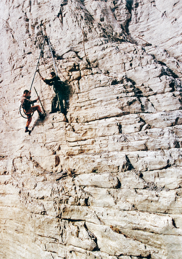 然而,在绝壁上开出一条天路,远比想象的更加艰难。没有工具,毛相林和村民们就腰系长绳,用大锤、钢钎、簸箕等简单的农具悬在空中钻炮眼;没有任何保护措施,他们在“炸了一炮”的垂直山体上,将炸开的缺口作为“立足之地”,用手挖,用脚蹬;高山绝壁没有人家,他们就住山顶、喝泉水、睡山洞。为早日修通绝壁路,毛相林最长一次在工地驻扎了3个月没回家。他说,我是修路发起人,最重的活、最危险的活必须带头。就像蚂蚁啃骨头一样,毛相林带领着下庄村人,在悬崖上艰难地一寸一寸向前推进。