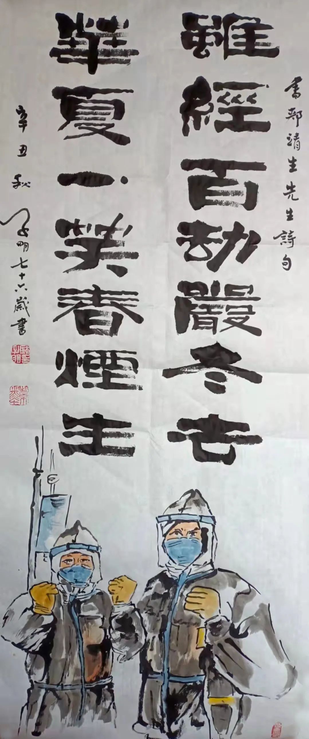 释文:医患配合同歼冠疫,干群联手共克时艰。作者:郭志福