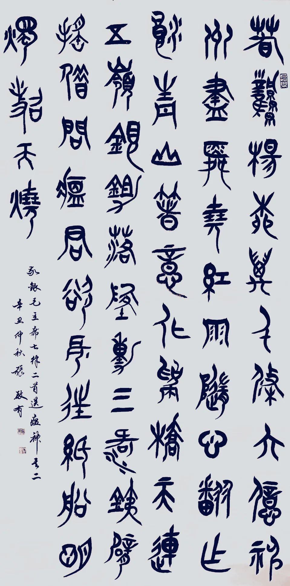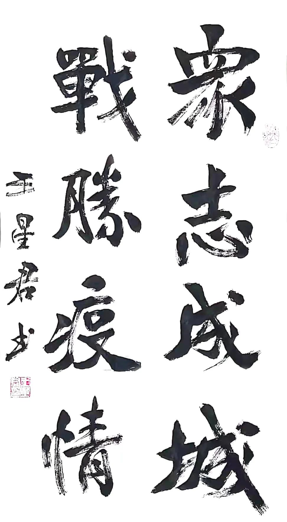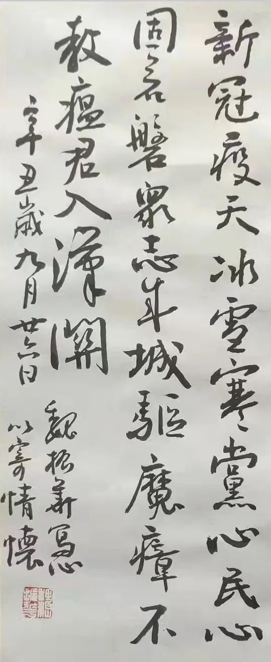 释文:新冠疫天冰雪寒,党心民心固若磐。众志成城驱魔瘴,不教瘟君入汉关。