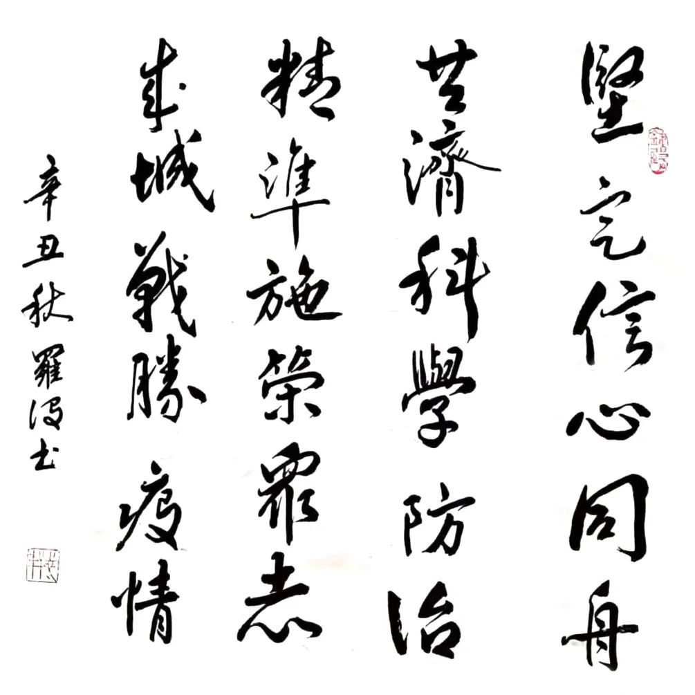 释文:坚定信心,同舟共济,科学防治,精准施策,众志成城,战胜疫情。
