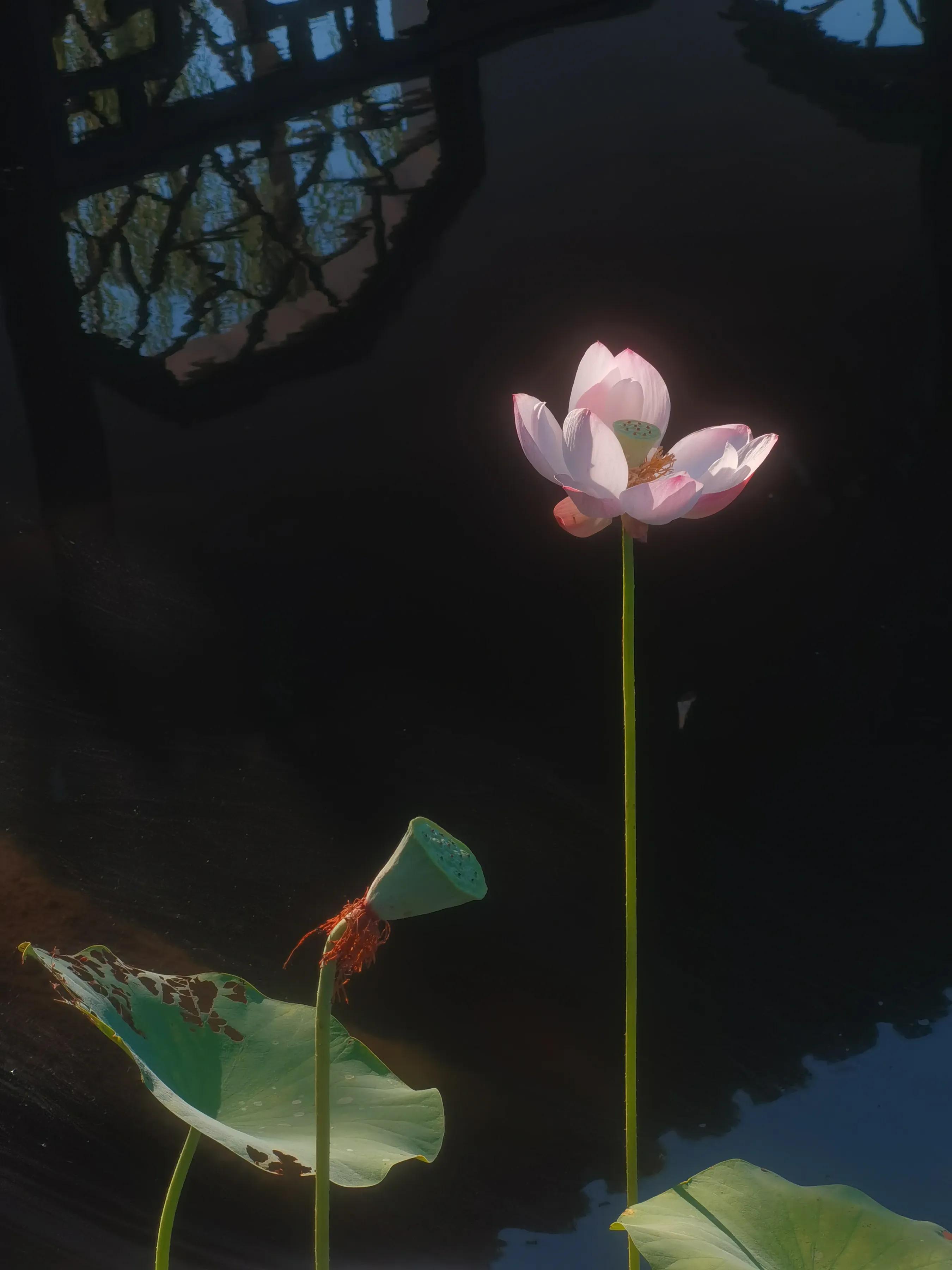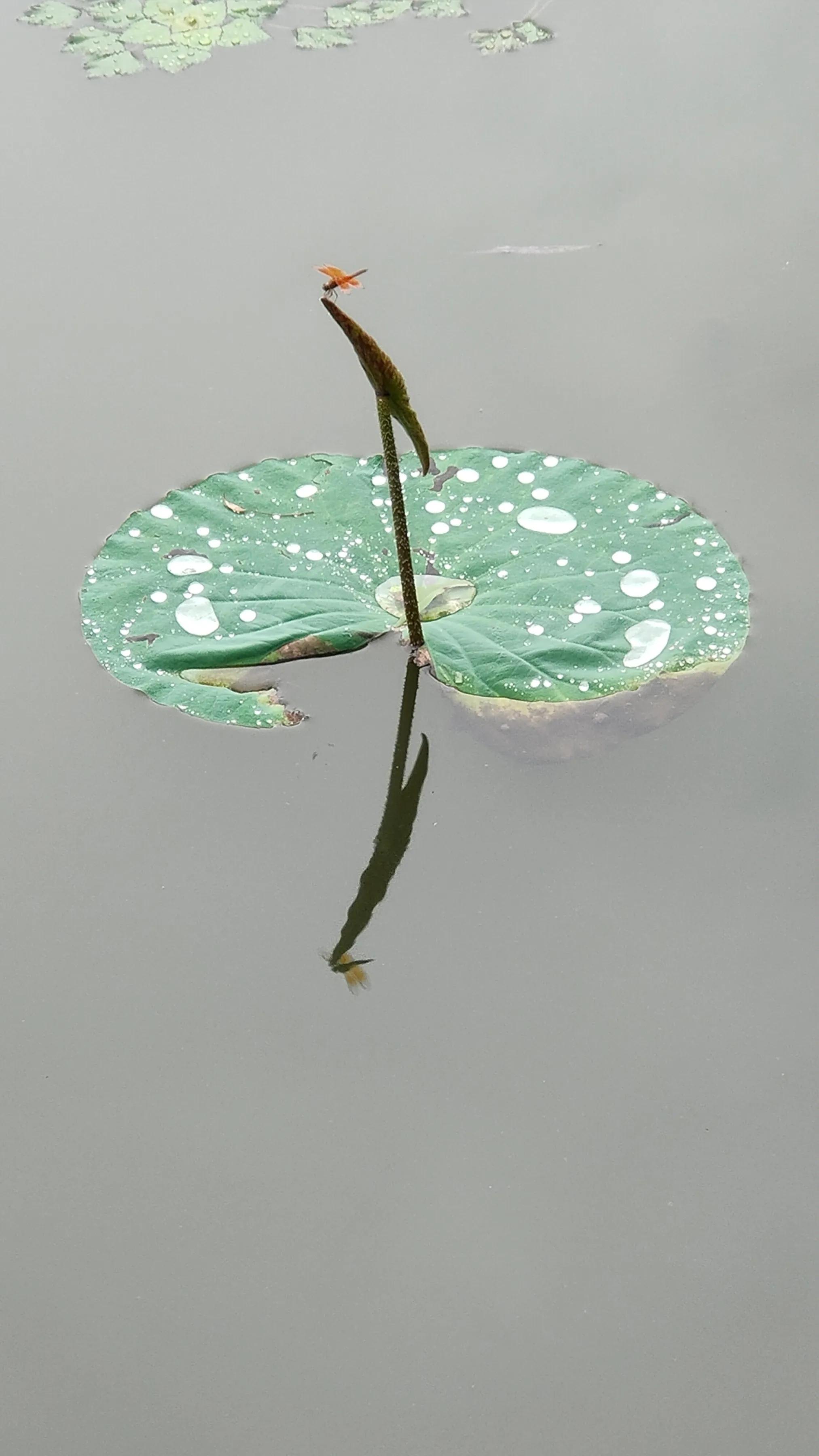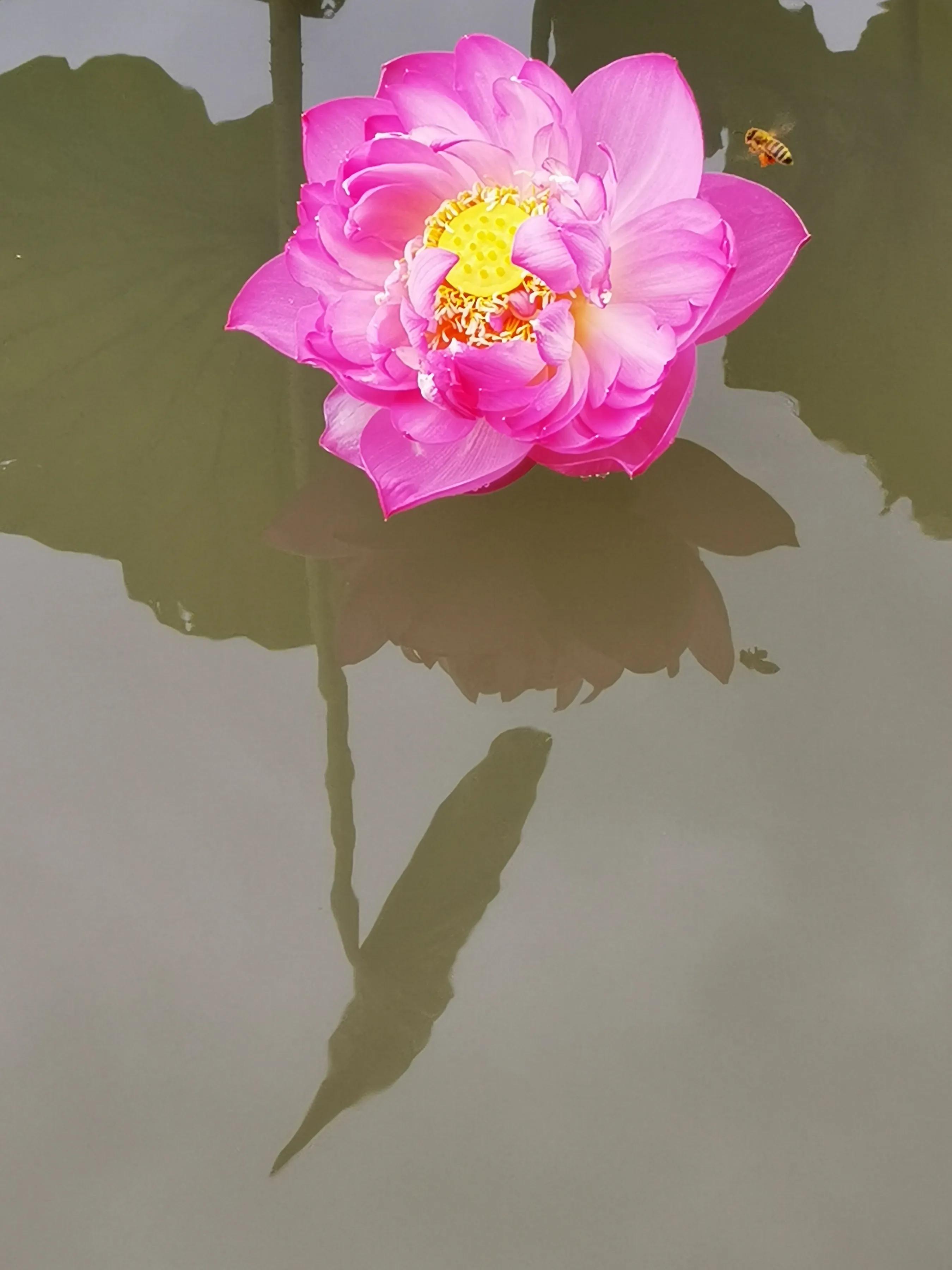 2.标题:一枝独秀引蜂舞,倒影荷叶水中现